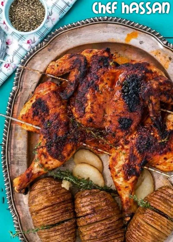 9- أخرجي الدجاجة المحمرة من الفرن وقدميها ساخنة على سفرتك.